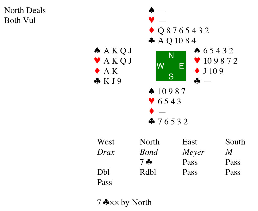 Na­gle Ba­sil­don po­jął, co się dzieje. To był ewi­dentny szlem, któ­rego Bond wy­gry­wał nie­za­leż­nie od spo­sobu obrony. Bez względu na to, co za­wi­stuje Meyer, Bond za­gra atu­tem z ręki albo ze stołu. Po­tem bę­dzie po­zby­wał się ko­lej­nych atu­tów i oczy­wi­ście za­gra na im­pas prze­ciwko Dra­xowi, a po dro­dze dwa razy wyj­dzie w kara, by prze­bić je atu­tem dziadka i zdo­być dzięki temu asa oraz króla. Po pię­ciu run­dach Bond bę­dzie miał po­zo­stałe atuty i sześć wy­gry­wa­ją­cych kar. Asy i króle Draxa okażą się kom­plet­nie bez­war­to­ściowe.