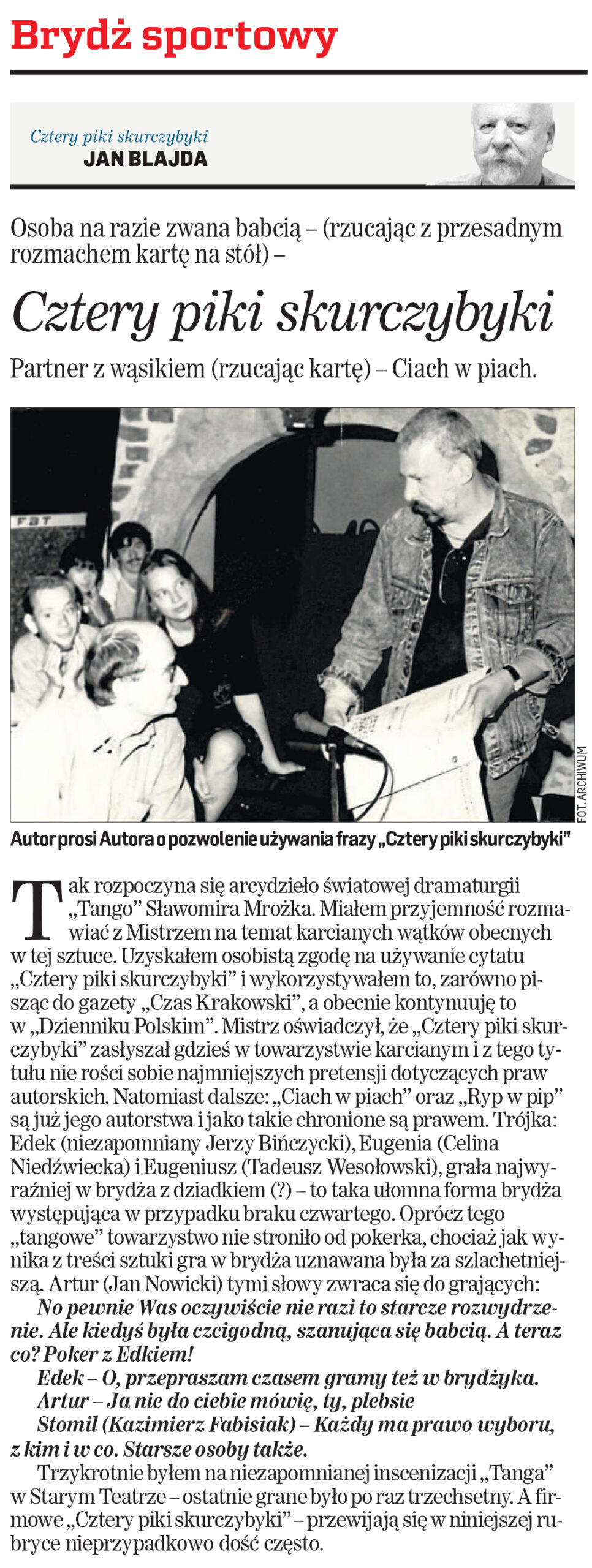 Tak rozpoczyna się arcydzieło światowej dramaturgii. „Tango” Sławomira Mrożka. Jan Blajda – z wykształcenia geolog, z zamiłowania brydżysta, muzyk amator z absolutnym słuchem, człowiek wielu pasji – należał do najbardziej barwnych postaci Krakowa. Przez lata prowadził w krakowskiej prasie rubrykę „Cztery piki skurczybyki”. Wspominał, że miał okazję rozmawiać z Mistrzem o obecnych w sztuce wątkach karcianych. Uzyskał nawet osobistą zgodę na wykorzystywanie cytatu „Cztery piki skurczybyki”. Jak mówił, Mrożek wyjaśnił mu, że sam zasłyszał to kiedyś w karcianym towarzystwie i nie rości sobie żadnych pretensji do praw autorskich.