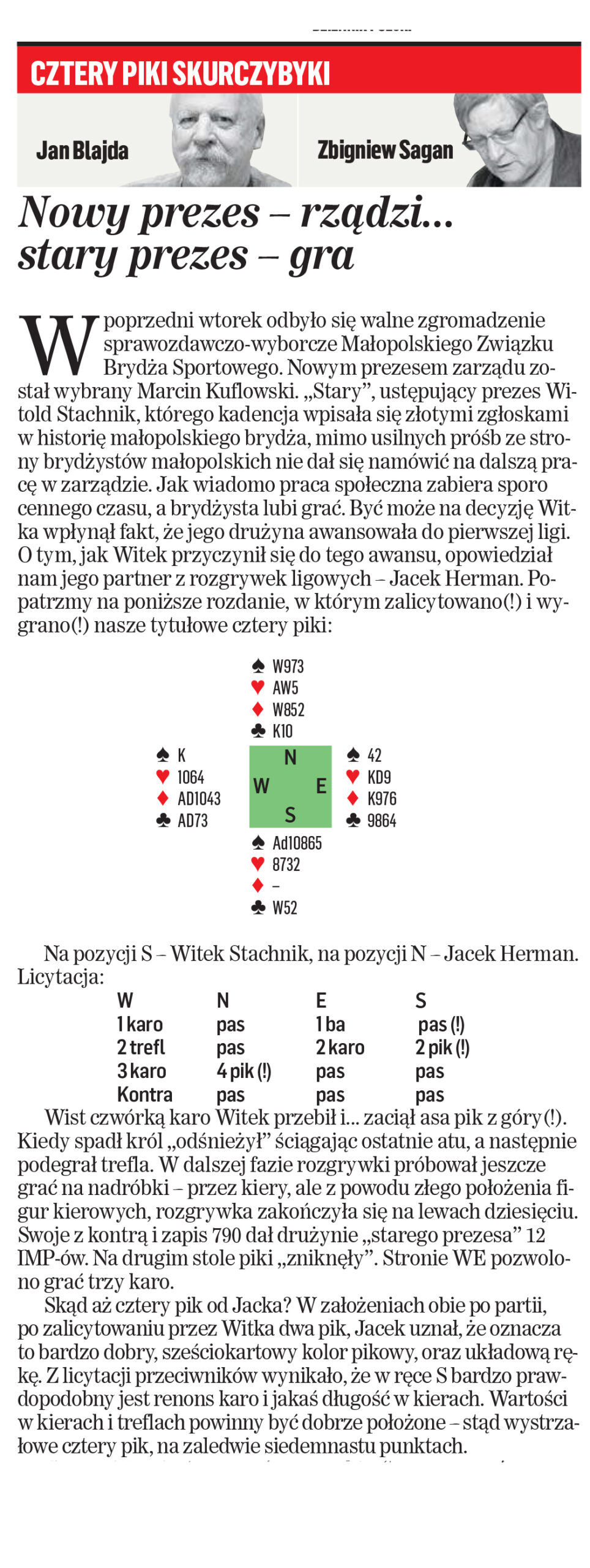 A ja sam wykorzystuję okazję „Tanga” i rubryki „Cztery piki skurczybyki” do małej autopromocji, ponieważ i mnie zdarzyło się w niej pojawić. Stąd też przywołuję pewne zdarzenie z meczu o awans do I ligi brydżowej…