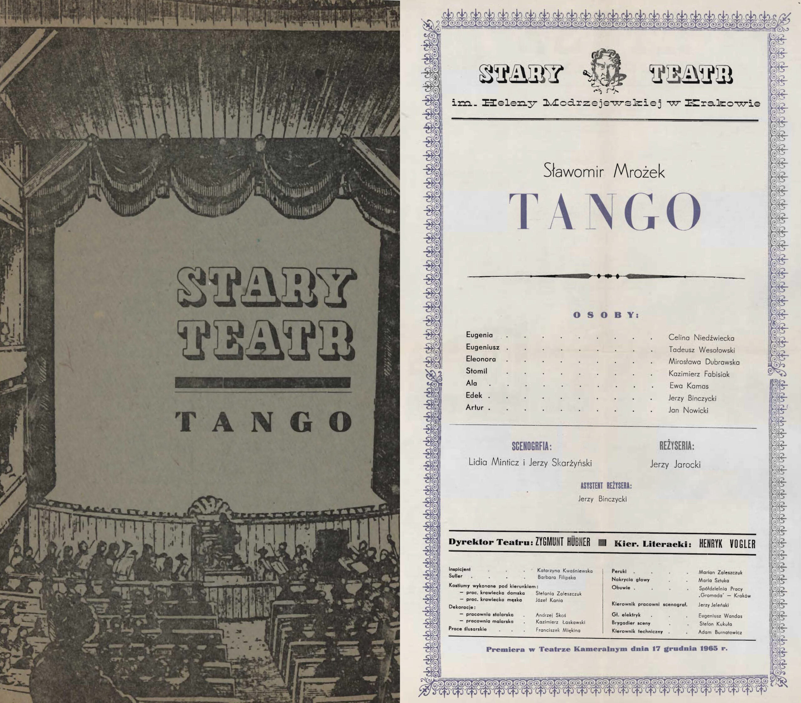 Światowa sceniczna premiera „Tanga” odbyła się w Belgradzie w 1964 roku, natomiast polscy widzowie mogli obejrzeć spektakl rok później – po raz pierwszy w Bydgoszczy. Jan Blajda wspominał również słynne przedstawienie ze Starego Teatru z 1965 roku, wyreżyserowane przez Jerzego Jarockiego, z Jerzym Bińczyckim w jednej z głównych ról.